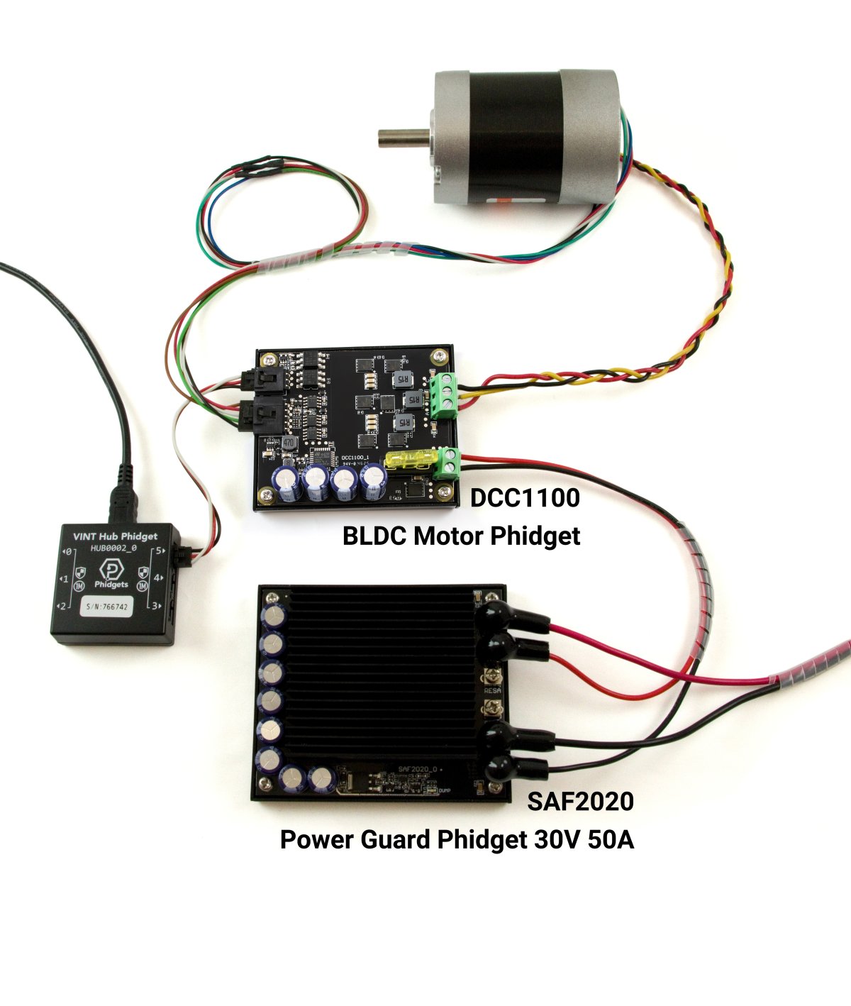 The BLDC Motor Phidget must be connected to a VINT Hub Phidget to function. A Power Guard Phidget is also required for most applications. For more information, review our Power Guard Guide.