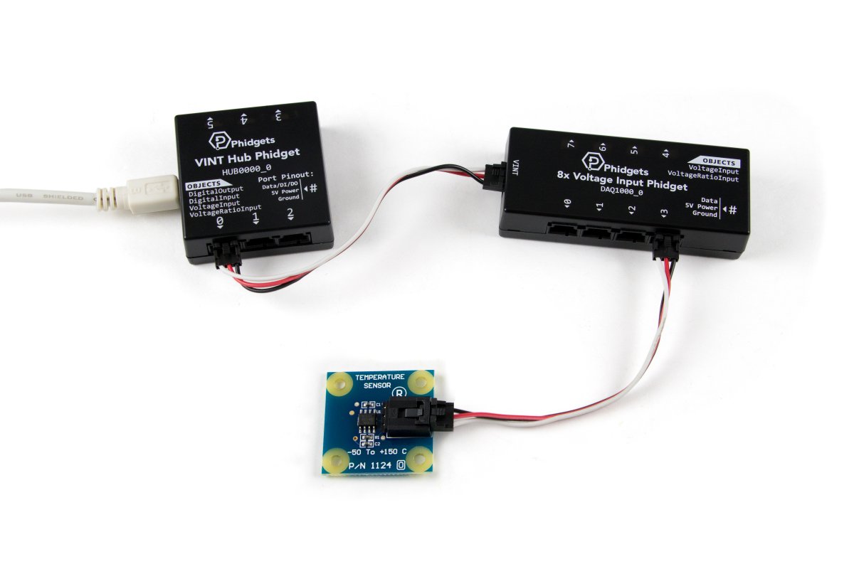 This sensor can be read by any Phidget with an Analog Input or VINT Hub port. It will connect to either one using a Phidget cable. VINT Hub ports can behave just like Analog Inputs, but have the added flexibility of being able to be used as digital inputs, digital outputs, or ports to communicate with VINT devices. For more information about VINT, see the VINT Overview page.